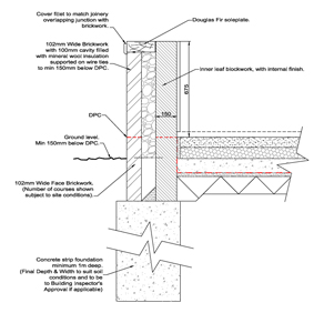 This is a low cavity wall which is usually used in a Garden Room for the frame and joinery to sit on. There is a soleplate that sits on the outside brick skin which is used to distribute the weight of the building along the whole wall and not just the points where the posts sit.